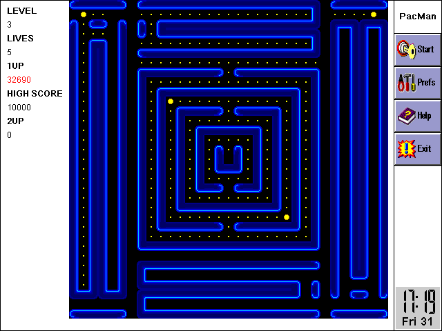 Published by Neuon, PacMan is a clone of the arcade game. It’s let down a little by EPOC’s redraw and animation speed, and the difficulty ramps quite unexpectedly.